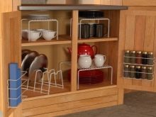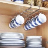 Mentre gli occhiali vengono semplicemente riposti sugli scaffali, le tazze sono molto più comode da posizionare sulla ringhiera: un tubo speciale con ganci o altri supporti che sono appesi dall'esterno o all'interno del mobile.A volte i ganci sono semplicemente fissati sulla superficie superiore dell'armadio e i cerchi sono appesi su di essi dalle "orecchie". Nei cassetti a pavimento per riporre questo tipo di piatti sono stati nuovamente utilizzati divisori.