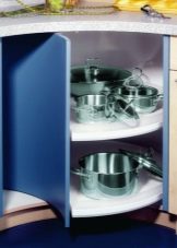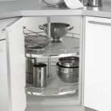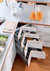 I vasi sono comodi da riporre negli armadietti a pavimento, ma nel caso del modulo angolare, dovrai acquistare un sistema a scomparsa aggiuntivo o un “carosello” rotante con ripiani girevoli.