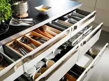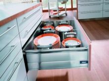 - Quando si posizionano i mobili sugli scaffali, è importante non sovraccaricarli e posizionare i piatti più pesanti sotto. Lo stesso vale per i cassetti, i cui elementi mobili si guastano rapidamente in caso di funzionamento improprio. Naturalmente, è necessario ridurre al minimo l'impatto meccanico, nonché gli effetti del vapore e dell'acqua. Pertanto, ad esempio, non è consuetudine posizionare gli armadietti per i piatti appena sopra la stufa. Ha anche senso rafforzare ulteriormente i cassetti con ammortizzatori e chiusure.
