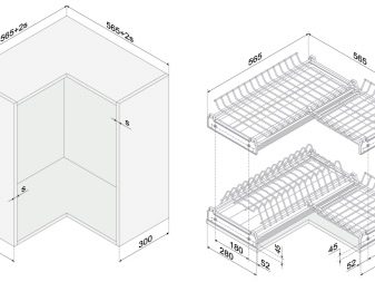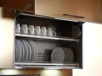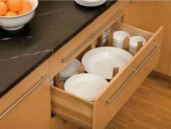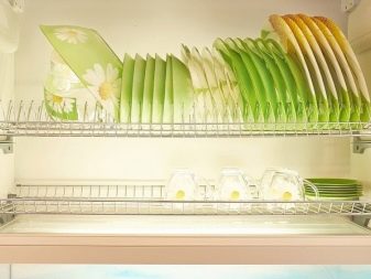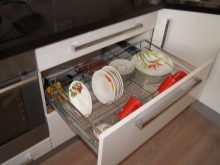 Una buona soluzione sarebbe quella di posizionare immediatamente un essiccatore nel modulo, che è un sistema metallico, sotto il quale è installato un vassoio, dove scorre l'acqua. Nei cassetti del pavimento abbastanza spesso vengono utilizzati speciali divisori che impediscono ai piatti di colpire le pareti e tra di loro.