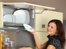 Nel caso in cui venga posizionata un'asciugatrice nell'armadio, la profondità del modulo dovrebbe essere uguale al diametro della piastra più grande. In generale, la migliore soluzione per la cucina è quella di utilizzare armadi di diverse altezze, sia con ripiani aperti che con porte cieche.