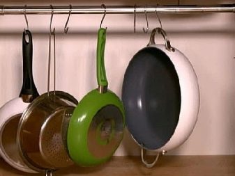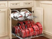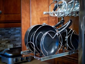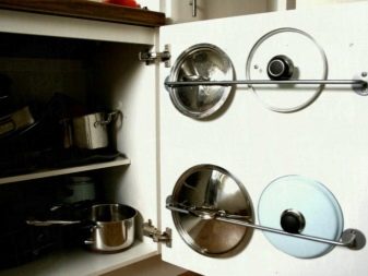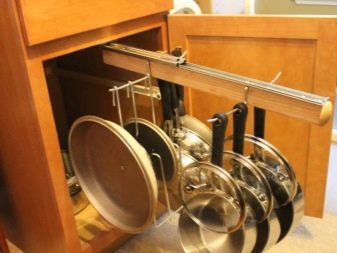 Le padelle saranno comodamente posizionate su binari o nei cassetti con delimitatori. Inoltre, un comprovato retrattile sistema di aggancio. Le coperture possono essere fissate internamente sulle ante o in appositi cassetti. Molte aziende hanno anche iniziato a creare supporti speciali posizionati all'interno del modulo pavimento e spesso a scomparsa. Una varietà di sistemi di ringhieresembrano cestini, tubi o ganci a rete.