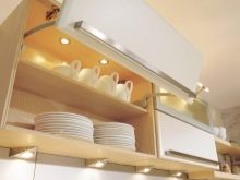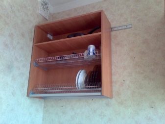 L'armadio da cucina a parete ha una capacità inferiore rispetto al pavimento, ma, essendo fissato sulla superficie del muro, consente di risparmiare una parte significativa dello spazio del pavimento. Non una singola piccola cucina, in cui è necessario ospitare molte cose per la conservazione, può fare a meno delle strutture a cerniera.