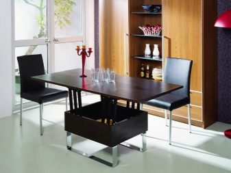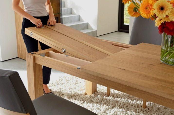 - Tavolo da pranzo con coperchio a cerniera allo stesso modo, è considerata una costruzione abbastanza ordinaria che non richiede competenze speciali per la produzione.
