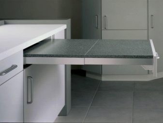 - Struttura scorrevole. Il punto è installare un inserto aggiuntivo, attraverso il quale aumenta l'area della superficie di lavoro. Il solito meccanismo distribuisce 2 metà del tavolo e all'interno della sezione aggiuntiva.