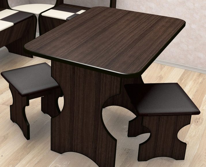- Un tavolo intricato, alla moda e conveniente esce dal pannello dei mobili. Può essere utilizzato in qualsiasi stanza. Il pannello del mobile è un foglio singolo o incollato da barre piallate con una larghezza non superiore a 600 millimetri.