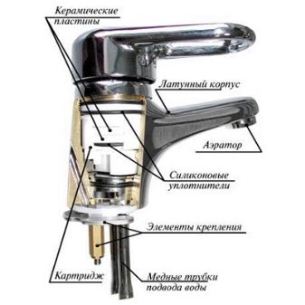 L'elemento principale di lavoro del mixer è una cartuccia. È in esso che i flussi d'acqua vengono miscelati e distribuiti in base allo scopo. Custodia per cartuccia - plastica, meno spesso - ceramica. Nella versione con un dispositivo a sfera - una sfera di metallo in acciaio inossidabile. Ha fori per acqua e monti.