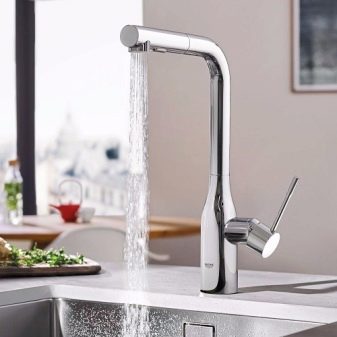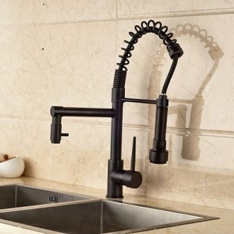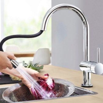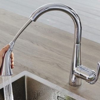 - Con beccuccio estraibile flessibile. Questo design è molto conveniente se il gander è piccolo. Un tubo retrattile consente di lavare piatti di grandi dimensioni con alta qualità o di attingere acqua in un secchio senza metterlo nel lavandino. Molto spesso, il tubo ha un ugello con una doccia spray.