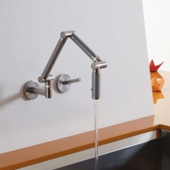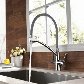 - Con doppio beccuccio o foro aggiuntivo per acqua filtrata. La presenza di un tale miscelatore in cucina consente di utilizzare un rubinetto per avere acqua da bere, per cucinare e per esigenze tecniche. Se il beccuccio è uno, ma con due ugelli per fornire acqua, nella configurazione potrebbero esserci due leve di comando. Con un doppio gander, sono possibili anche variazioni, tutto dipende dal modello e dall'idea del produttore.