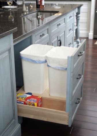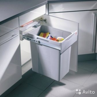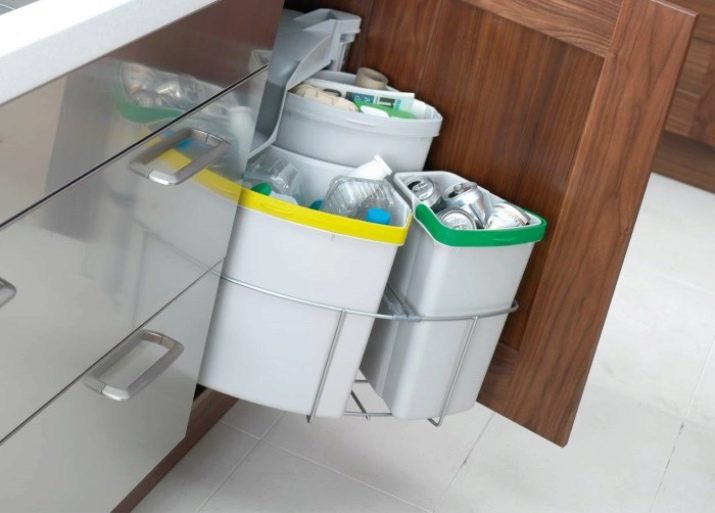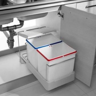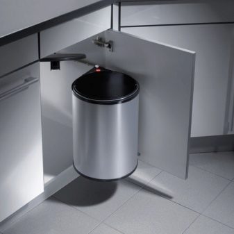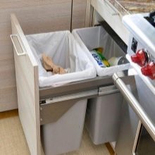I contenitori rettangolari, quadrati e triangolari si montano meglio sulla porta dell'armadio, ma tenere presente che lo spazio sotto il lavandino dovrebbe essere sufficiente non solo per il secchio, ma anche per il sifone di scarico. Le amanti che amano cucinare dovrebbero prestare attenzione al design a scomparsa, che accelera notevolmente il processo di cottura. Un contenitore rotondo che può essere posizionato nell'angolo della cucina si adatterà armoniosamente all'interno.