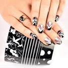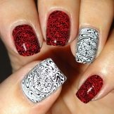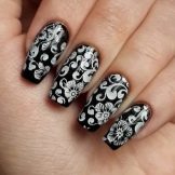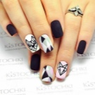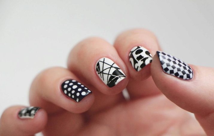 Per le ragazze, un normale bianco e nero sembra noioso, quindi gli stilisti si offrono di diversificarlo con accenti luminosi. Per fare questo, uno o due chiodi possono essere coperti con un motivo grafico o floreale usando colori ricchi. Semplici motivi geometrici bianchi, legature o motivi sottili su uno sfondo nero hanno completezza e concisione, quindi sono anche appropriati e passano il codice di abbigliamento. Gli appassionati di minimalismo, torneranno utili.