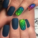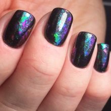 Un elemento fondamentale della tecnologia è il foglio olografico. Viene tagliato in pezzi separati sotto forma di frammenti di vetro. Su uno sfondo nero sembrano particolarmente impressionanti. La posizione dei pezzi sulla superficie della lamina ungueale dipende esclusivamente dalla fantasia del maestro. Può essere verticale, orizzontale, caotico, solo lungo i bordi o vicino al buco.