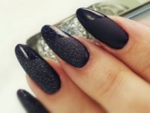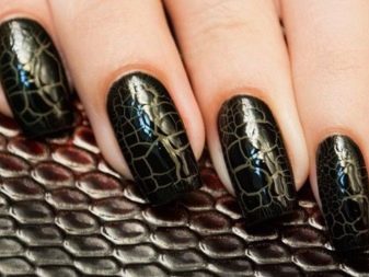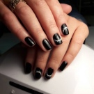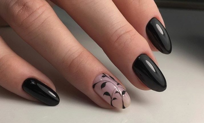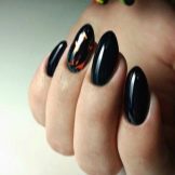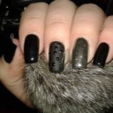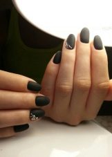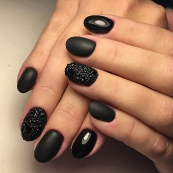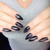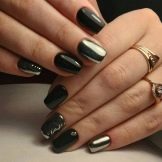 Il design moderno delle unghie presta particolare attenzione alla manicure nera. Poiché questo colore è universale, è appropriato "anche a una festa, persino al mondo". Per lui, non ci sono cliché consolidati, può essere combinato con qualsiasi sfumatura e trama. L'unica raccomandazione è una punta sulla lunghezza delle unghie: è meglio se è corta o media. Lo smalto nero non è raccomandato per l'applicazione su unghie quadrate; sembra più vantaggioso se sono rotondi.