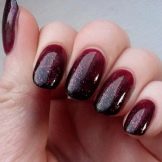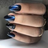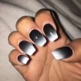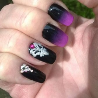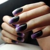 Ombre è una speciale tecnica a gradiente per la colorazione delle unghie. Grazie a questo metodo, i maestri, creando transizioni fluide tra le tonalità, ottengono un design unico. Con una base di base nera, la manicure acquisisce saturazione e profondità. Inoltre, le ombre possono essere utilizzate non solo per le sfumature di colore, ma anche per luccichii o scintillii, e sembra anche spettacolare in combinazione con altre tecniche. Ad esempio, ombre con sfregamento. Dal momento che il materiale di sfregamento si presta a una buona ombreggiatura, anche i maestri principianti saranno in grado di creare una manicure brillante unica senza troppi problemi.