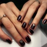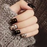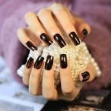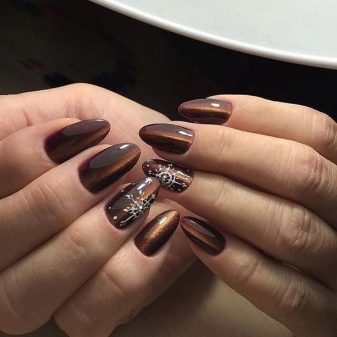 Il marrone, come il nero, è la tonalità di base, quindi si fondono perfettamente tra loro. Sulla superficie lucida di cioccolato e perle, i disegni di sabbia di velluto nero sembrano grandi. Se sono anche decorati con strass, il risultato sarà appropriato non solo per l'ufficio, ma anche per una buona cena. Straripamenti di occhi di gatto neri e marroni fanno apparire le unghie come sfumature naturali uniche di un vero minerale.