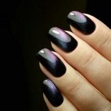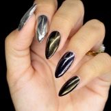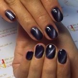 In natura, esiste un minerale chiamato occhio di gatto. È caratterizzato da insolite colorazioni futuristiche. Una manicure con un nome simile è progettata per ripeterla. Un componente speciale della vernice è la polvere di metallo, che dona lucentezza e durante la lavorazione crea una trama simile a una gemma. Un magnete viene utilizzato per l'esposizione. La tecnica dell '"occhio di gatto" sembra spettacolare sulla vernice nera, poiché le macchie magnetiche metalliche creano motivi spaziali.