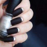 Un altro modello da ufficio è un classico design per unghie francese. In questo caso, la striscia bianca sul bordo superiore dell'unghia viene sostituita da una nera. Per gli amanti della diversità, gli stilisti offrono una giacca nera bicolore con una finitura opaca e lucida. Anche in uno stile aziendale, disegna le unghie con un design lunare. Ci sono anche molte varianti. O il platino per unghie è ricoperto di vernice nera e i fori non vengono verniciati o viceversa. Una manicure lunare bicolore in combinazione con il nero e una delle tonalità pastello è popolare. Sembra gentile e morbido.