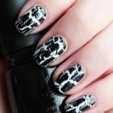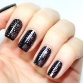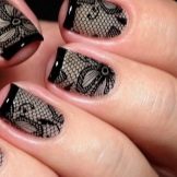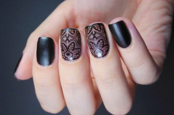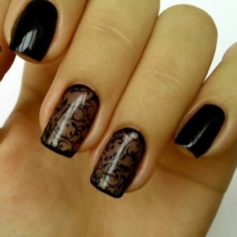 Manicure ricca, ma allo stesso tempo elegante, realizzata con la tecnica del "velo". I motivi sono realizzati in diversi modi e materiali. Il design con pizzo nero sabbia, decorato con singole gocce o strass colorati, sembra spettacolare. Le tonalità metalliche su uno sfondo nero sono sempre popolari. Le opzioni più comuni sono con una croce, raggi, spirali e geometria più complessa. È adatto per creare immagini futuristiche di tendenza.
