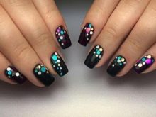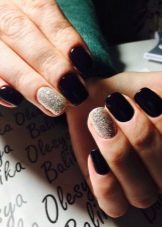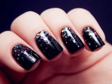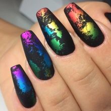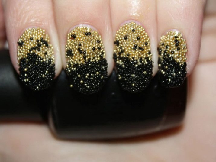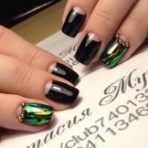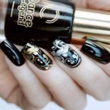 Combinazioni impressionanti si ottengono con una combinazione di nero e oro. Diverse calendule con un motivo brillante trasformeranno la manicure, rendendola regale bella e ricca. Per migliorare l'effetto aristocratico, gli stilisti suggeriscono di utilizzare modelli di sabbia nera opaca con vernice nera opaca o di creare un "caviale nero" dorato usando piccole perline. Il manicure con "vetri rotti" su una base scura appare vivacemente festoso. Per questo viene utilizzato un film olografico di diversi colori. Può essere argento, oro, multicolore. Dai "frammenti" creare composizioni o coprire solo una parte della lamina ungueale, ad esempio il foro.