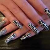 I motivi geometrici più popolari sono sia bianchi che neri e viceversa. Sono anche possibili combinazioni di questi colori realizzati con tecniche diverse. Ad esempio, una giacca nera è rilevante per l'uso quotidiano e la manicure lunare sembra elegante e ordinata. L'imitazione di una zebra è possibile non solo sulle strisce orizzontali e verticali, ma anche su quelle ondulate. I maestri avvertono che una tale colorazione sembra un po 'aggressiva, quindi è meglio accentuare una o due unghie su ogni mano e coprire il resto con vernice nera in bianco e nero o dare loro una consistenza.