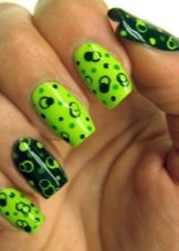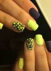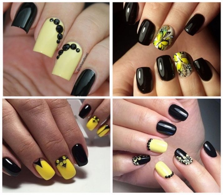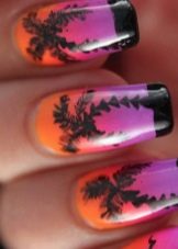 Il colore nero può essere diluito con brillanti colori estivi, riprodurre i disegni corrispondenti e ottenere un'eccellente manicure per le vacanze. Agli stilisti piace usare combinazioni gialle per i look estivi, in quanto associati alla luce solare. Usalo per disegnare girasoli su uno sfondo nero o brillanti macchie solari. La manicure estiva prevede l'uso di vernice nera per enfatizzare la luminosità e la saturazione delle tonalità selezionate: verde, verde chiaro, turchese, fucsia, arancione. Non ha un ruolo da protagonista qui.