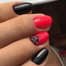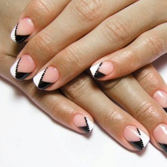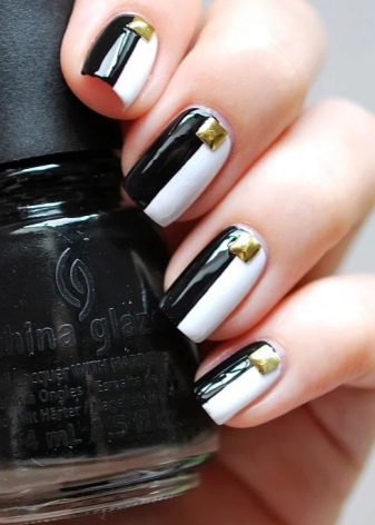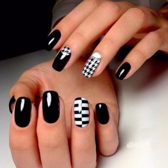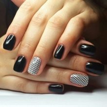 Come già accennato in precedenza, il nero è il colore di base ed è combinato con qualsiasi sfumatura. Più recentemente, è stato popolare accentuare 1-2 unghie su ciascun braccio in una manicure. Tuttavia, al giorno d'oggi, le tendenze moderne danno origine a nuove idee e tendenze. La combinazione di bianco e nero è una versione classica della manicure. È universale, che ti consente di utilizzarlo nella tua immagine aziendale quotidiana e anche con l'aggiunta di elementi decorativi per trasformarlo in uno festivo per occasioni speciali.