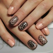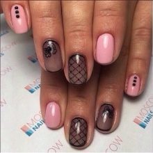 Lo stile naturale inizia una nuova vita nel mondo moderno. I contrasti vividi sono talvolta inferiori alle tonalità naturali: crema, pesca e carne. Nella manicure, i toni polverosi sono popolari come complemento del nero. Lo smorzano un po ', rendendoli più contenuti. Puoi creare uno stile romantico combinando il rosa con il nero. Inoltre, più luminosa è l'ombra, più festosa appare la manicure. Su uno sfondo beige, il pizzo nero sottile, realizzato con un pennello sottile, ha un bell'aspetto. Il rivestimento di base può essere realizzato in una versione opaca e il motivo in lucido.