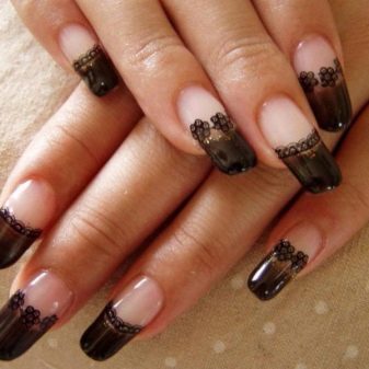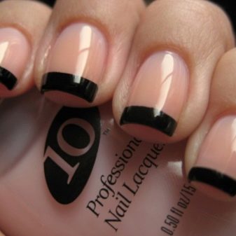 Ci sono altre variantiAd esempio, una base rosa pallida e una striscia nera sul bordo dell'unghia sopra o sotto la cuticola. Trasparente, come se impolverato di neve, il rosa durante la formazione della "giacca" con un motivo unico nero rende il design elegante e sofisticato. Spesso, la scelta delle spose ricade su di lui, il che è comprensibile in linea di principio. Essendo quasi un oggetto d'arte, conserva allo stesso tempo lo stile del romanticismo e dell'innocenza. Uno sfondo lilla pallido viene utilizzato anche se si desidera ammorbidire il colore nero.