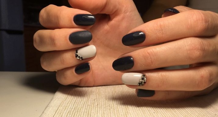 Le opzioni più classiche sono realizzate in uno stile aziendale e sono adatte per l'ufficio. Delle tendenze alla moda degli ultimi anni, una finitura opaca dovrebbe essere evidenziata. Di per sé sembra spettacolare ed è molto popolare. Se lo diversifichi con variazioni con una vernice lucida e decori le articolazioni con strass neri, il risultato sarà una manicure trattenuta, concisa, ma molto elegante.