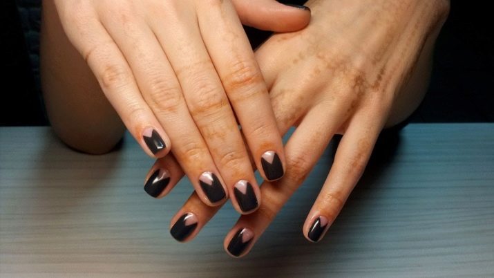 Le tonalità nude in combinazione con il nero sono adatte per le ragazze romantiche. Morbidiscono leggermente il buio, rendendo l'intera immagine più morbida e sono molto vantaggiosamente combinati con l'ufficio e gli abiti di tutti i giorni. Esistono molte varianti: dai disegni ordinari alle ombre, e con l'aggiunta di strass o altri accenti luminosi, la manicure acquisisce caratteristiche festive.