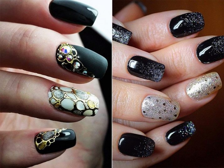 Alle celebrazioni, le donne vogliono apparire sbalorditive, quindi una manicure viene scelta luminosa, festosa, con bellissimi elementi decorativi. Le variazioni su uno sfondo nero sono ricche e chic. Puoi aggiungere eleganza alla vernice nera monofonica, decorandola con perline, strass, varie scintille. Il loro splendore alla luce dei riflettori attirerà l'attenzione sul suo proprietario.