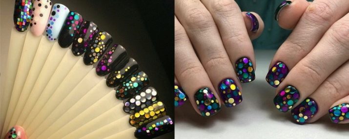 Kamifubuki è un design molto originale proveniente dal Giappone. Questa è una manicure con adesivi, che viene eseguita su una base nero carbone. I Kamifubuki sono coriandoli rotondi multicolori di diverse dimensioni. Sono incollati sullo sfondo e coperti con una parte superiore trasparente. Il risultato è sorprendente, la manicure è festosa e luminosa.