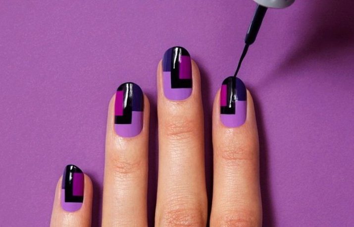 In generale, tutti i colori pastello sembrano spettacolari con la vernice nera. Inoltre, se fungono da sfondo principale e i motivi sono realizzati in colore scuro, allora si tratta di variazioni più delicate. Nel caso opposto, si ottiene una manicure contrastante. Una manicure con una marcata vernice viola è sempre stata all'apice della popolarità. Le sue sfumature profonde e gli overflow magici attirano lo sguardo. I colori adiacenti nella palette sono lilla, viola e melanzana. Con l'intera palette, le ombre con il nero sembrano sorprendentemente organiche e ricche.