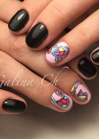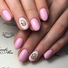 La fantasia in questo tipo di arredamento non ha praticamente confini.Sulle unghie rotonde tutto sembra appropriato: pittura floreale, ornamenti, fantasie sofisticate, pizzo in pizzo. Tutte queste opzioni sono insolitamente femminili, si adattano perfettamente a qualsiasi immagine dalla strada al romantico. Opzioni più concise per la pittura: iscrizioni, formule, geroglifici si adattano perfettamente alle unghie rotonde.