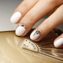 Per decorare le unghie per la celebrazione, è necessario migliorare leggermente l'impressione con l'aiuto della decorazione. Composizioni di pietre, strass, con glitter, riflessi, sfumature di metallo: tutto ciò che brilla e brilla perfettamente farà rivivere qualsiasi insieme sobrio.