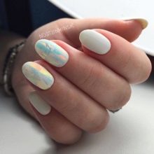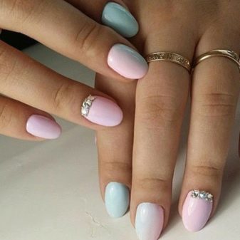 Questa è una scelta perfetta e impeccabile di colori per unghie rotonde sia lunghe che corte. Morbide tonalità di menta, pesca, blu, grigio, lavanda, limone saranno il rivestimento perfetto per questa forma. Le tonalità mute si combinano perfettamente con la naturale forma morbida delle unghie, la sua levigatezza. Questa gamma si combina armoniosamente con qualsiasi immagine, sembra autosufficiente anche senza elementi decorativi.