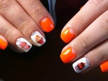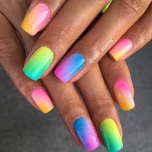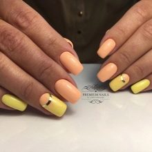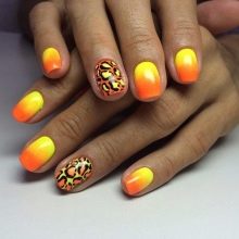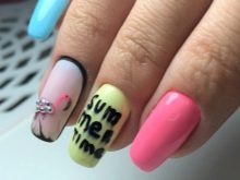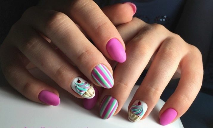 Coloro che non amano usare la pittura in manicure possono preferire la tecnica delle ombre. Basta scegliere la tavolozza di colori che ti piace e si fonderà perfettamente con il tuo look quotidiano. Puoi fare una "manicure dolce" decorando le unghie con muffin succulenti o gelato nel corno. Le iscrizioni in lingua inglese associate all'estate sembrano interessanti sulle unghie: sole, ciao estate. Naturalmente, tali inserti per scrittura sono adatti per la decorazione selettiva di una o due calendule.