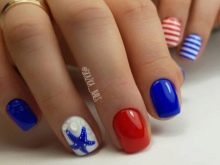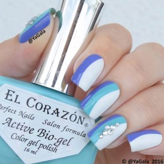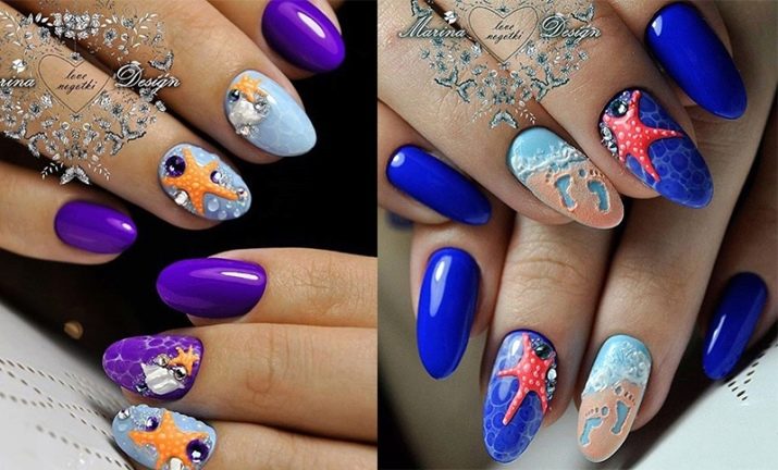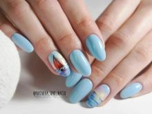 Sempre di moda in estate, manicure marina. Questa stagione ha un design minimalista particolarmente rilevante. Ad esempio, puoi usare strisce o onde bianco-blu su tutte le unghie. L'enfasi su un dito sembra elegante (sotto forma di una stella marina, un pesce rosso, uccelli, un faro, un'ancora, una barca, un timone, bandiere di segnalazione, un salvagente, squali, nuvole, occhiali da sole o un guscio) e lo stesso design delle unghie rimanenti. Una sfumatura fatta in blu e blu sarà bellissima.