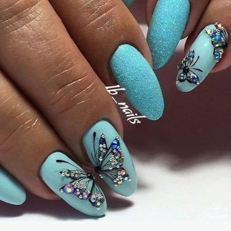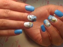 Sembra una manicure meravigliosa in stile marino. Tutte le unghie, ad eccezione di quelle senza nome, sono coperte di lucentezza blu. Quest'ultimo viene applicato con una vernice blu pallida con macchie bianche e sabbia imitante con polvere rosa. Le impronte lasciate su di esso sembrano molto originali. Anche il dito medio è coperto di macchie biancastre e di una stella marina di colore rosso vivo. Intorno a quest'ultimo sono raggruppati strass trasparenti e neri di varie dimensioni, nonché brodi.