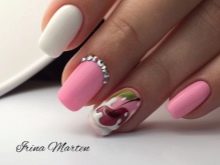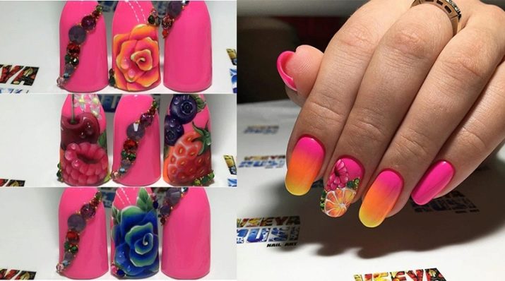 Una vera atmosfera estiva creerà un'ombra rosa-gialla con un dito medio dipinto con frutti succosi. Una fetta di arancia e una bacca di lampone sembrano molto naturali, quasi tangibili. Lo spazio libero tra loro è decorato con strass di medie dimensioni "sotto il verde".