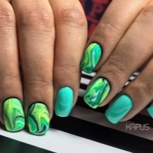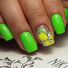 Molto alla moda nel design estivo delle unghie una succosa tinta verde. Si abbina bene al giallo brillante e regala un'atmosfera davvero estiva. Un'ombra così ricca attira le opinioni degli altri. Manicure verde adatta per abiti, gonne e prendisole in chiffon leggero. Questo colore è adatto per unghie di qualsiasi configurazione e lunghezza.