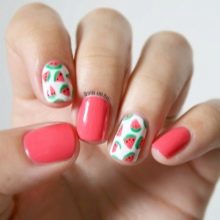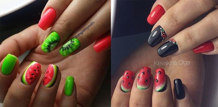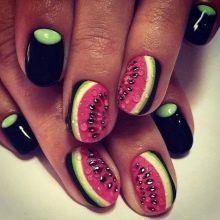 Manicure rosso verde brillante con fette di anguria e fette di kiwi. Allo stesso tempo, nel design viene utilizzato un gioco di pittura interessante: le unghie sulla mano sinistra sono ricoperte di vernice verde lucida e il medio e l'anulare sono decorati con pezzi di anguria, con semi e fresche gocce d'acqua. Le unghie sulla mano destra sono ricoperte di vernice rossa lucida, mentre quelle senza nome e quelle centrali sono dipinte "sotto il kiwi". Il design complessivo sembra luminoso e fresco.