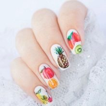 Per l'estate, voglio sempre scegliere opzioni di smalto belle e succose che tutti hanno perso così tanto per il lungo inverno. Una delle opzioni più eleganti per decorare le calendule è dipingere con i frutti. Tale design può essere realizzato in colori chiari o scuri. La decorazione delle unghie più popolare è con fragole o lamponi, arance, ciliegie, anguria, ananas, cocco, limone e kiwi. Non è necessario dipingere tutte le unghie, è sufficiente dare un'enfasi originale all'anulare (o al centro e all'anello) e coprire le unghie rimanenti con un semplice smalto gel. Per un maggiore realismo e volume, i frutti sono decorati con goccioline. Particolarmente spettacolare, quest'ultimo guarda sulla base di rivestimenti color polvere metallizzata o opaca.