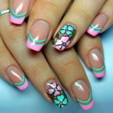 Un tema integrale per il design estivo delle unghie sono motivi floreali, farfalle, coccinelle, libellule, decorazioni con strass, kamifubuki, glitter (oro e argento). Tutto ciò aggiungerà un'immagine della festività. La cosa principale è non sovraccaricare le unghie con decorazioni, basta selezionare una o due dita. Se parliamo di temi floreali, i più popolari per l'immagine: rose, orchidee, margherite, girasoli, iris. Puoi fare un grande fiore sull'unghia o diversi altri in miniatura. In assenza di tempo, i fiori non possono essere disegnati, ma incollati sotto forma di applicazioni.