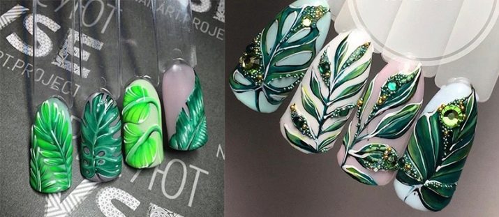 Il tema delle piante, come sempre, è molto rilevante. Gli sguardi incuriositi di quelli intorno causeranno unghie dipinte con rami e foglie verdi, decorate con grandi strass e brodi. La naturalezza dei disegni conferisce una forma non del tutto perfetta.