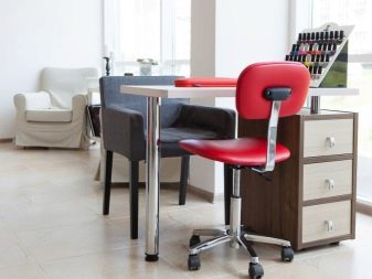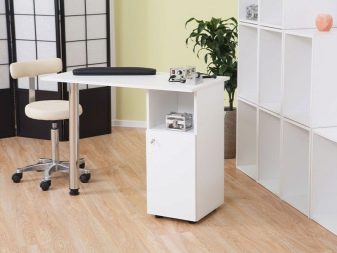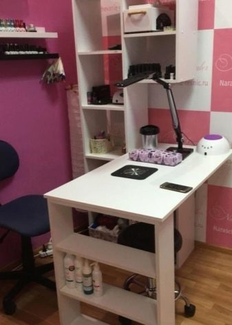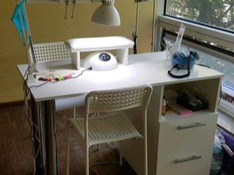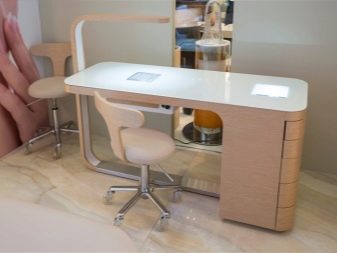 La superficie di lavoro del manicure dovrebbe contenere un gran numero di strumenti e allo stesso tempo non apparire ingombra. Pertanto, è importante scegliere un'opzione ergonomica e capiente in modo che sia conveniente non solo per il master, ma anche per il cliente. Sul tavolo stesso, di regola, c'è una lampada per asciugare le unghie, un rullo per le mani, i tovaglioli usa e getta e un apparecchio per la lavorazione delle cuticole. Un forno a secco e disinfettatori potrebbero essere nelle vicinanze, ma non necessari.