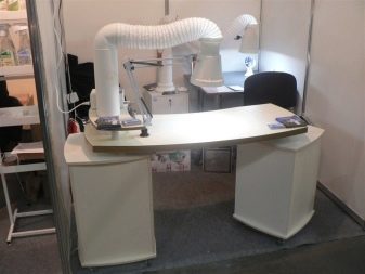 I tavoli Hood sono anche popolari. Non è necessario acquistare una cappa o un aspirapolvere separati. La cappa si trova sotto il tavolo e non interferisce con il client o il master. Sul piano di lavoro sono presenti numerosi fori attraverso i quali vengono pulite la superficie di lavoro e l'aria.