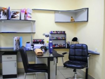 Vernici, smalti gel, accessori per manicure si trovano di solito su uno scaffale o uno scaffale appeso accanto al tavolo. Questo è conveniente, poiché il cliente, arrivando al master, seleziona la tonalità desiderata di rivestimento sulla "margherita" e il master non ha bisogno di un gran numero di bottiglie a portata di mano.