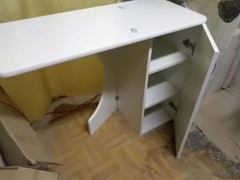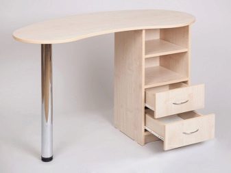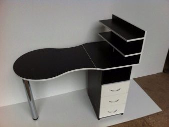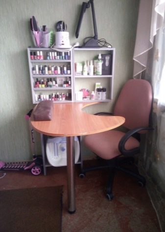 Un'altra opzione è un tavolo per manicure ad angolo con una mensola integrata per vernici e un piedistallo. Tali mobili non occupano molto spazio.