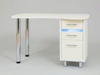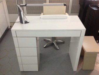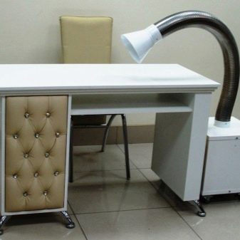Molti tavoli per manicure sono dotati di illuminazione: una o due lampade. Questo è abbastanza conveniente, perché l'ergonomia del tavolo è già stata pensata e il master non ha bisogno di fonti di luce aggiuntive.